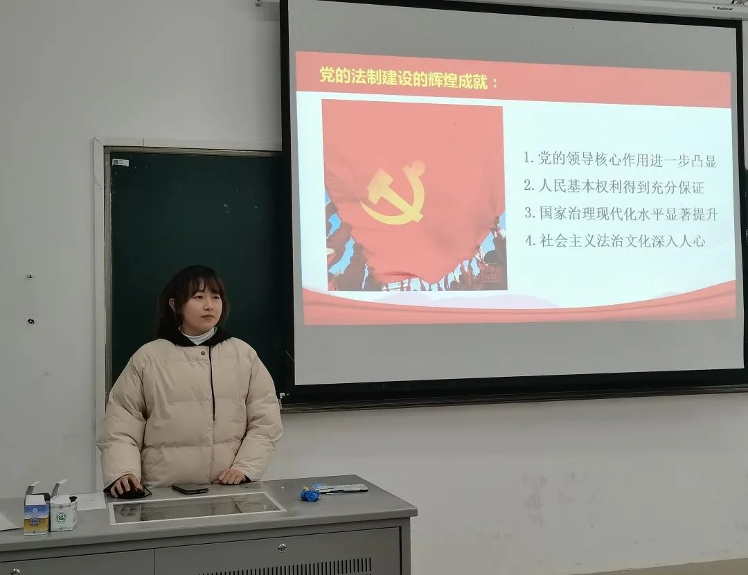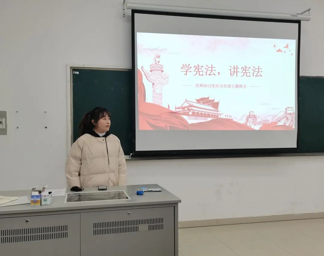 为带领同学们深入学习宪法知识,维护宪法权威,汉师2012于教六112开展了“学宪法,讲宪法”的主题班会课。本次班会分为四个部分:领会习近平法治思想、学习宪法知识、了解党的法治建设的辉煌成就以及弘扬宪法精神。通过这四部分的详细介绍与讲解,本次班会呼吁同学们贯彻习近平法治思想,努力学好宪法、讲好宪法、守好宪法,并厚植爱国主义情怀,携手共同营造尊崇宪法的校园法治文化氛围。
