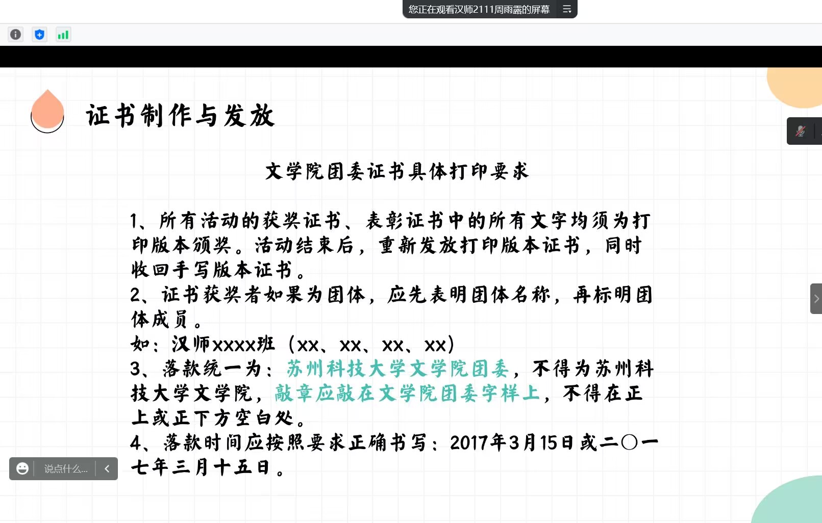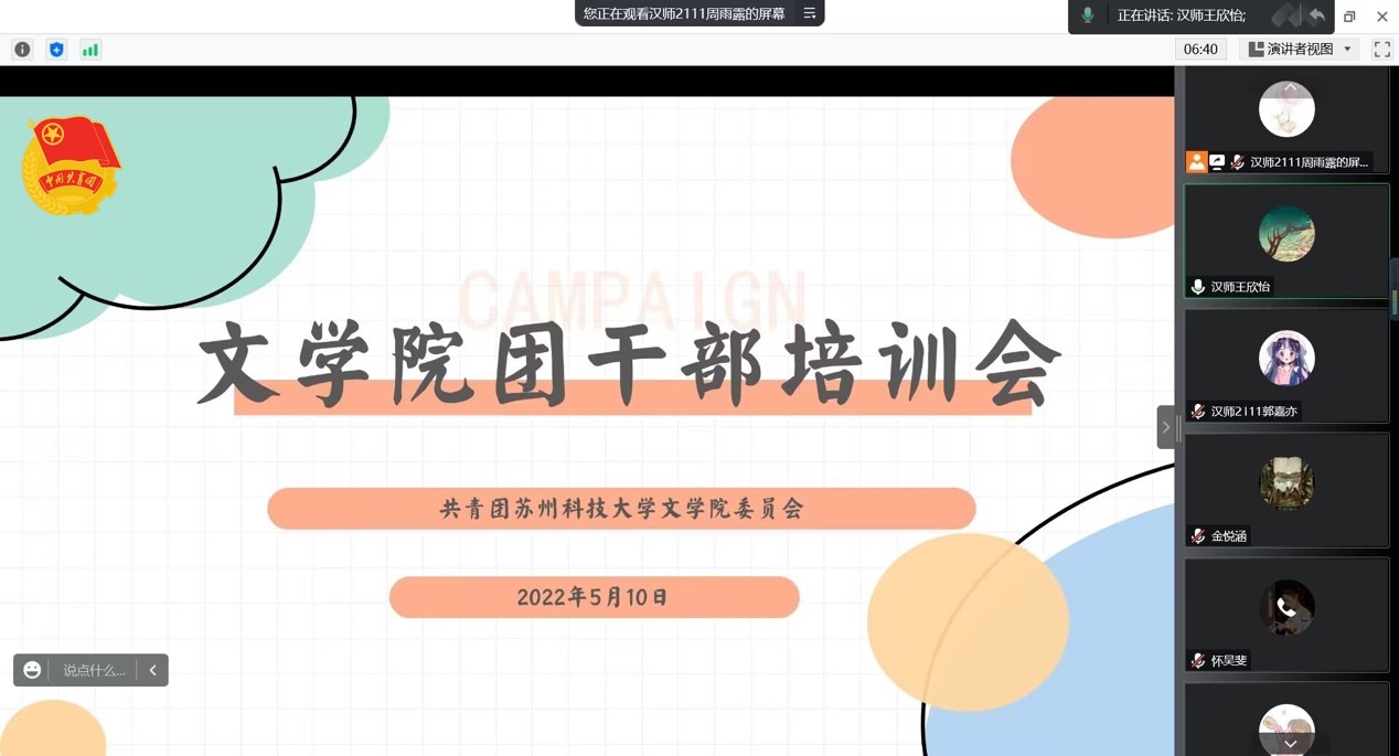 在培训会上,主讲人首先清楚阐明团委各项工作要求与标准,并讲解相关技能,包括新闻稿写作、借用教室、证书制作与发放、开发票流程与张贴悬挂物审批等部分。其中着重强调了拟通知的格式规范与新闻稿的写作要求,表明其内容应高度概括并详略得当。其次,讲述了团组织关系转接相关事项和智慧团建录入管理的操作规范。最后,主讲人提出团干部应注重理论与实践相结合,并强调了团委工作中干部配合的重要性,为团干部明确了工作规范,细化了相关要求。