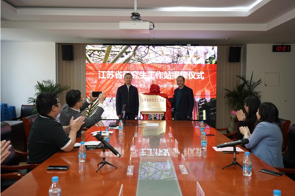 李勇与江苏省苏州第一中学董事长唐敏共同为“江苏省研究生工作站”揭牌。
