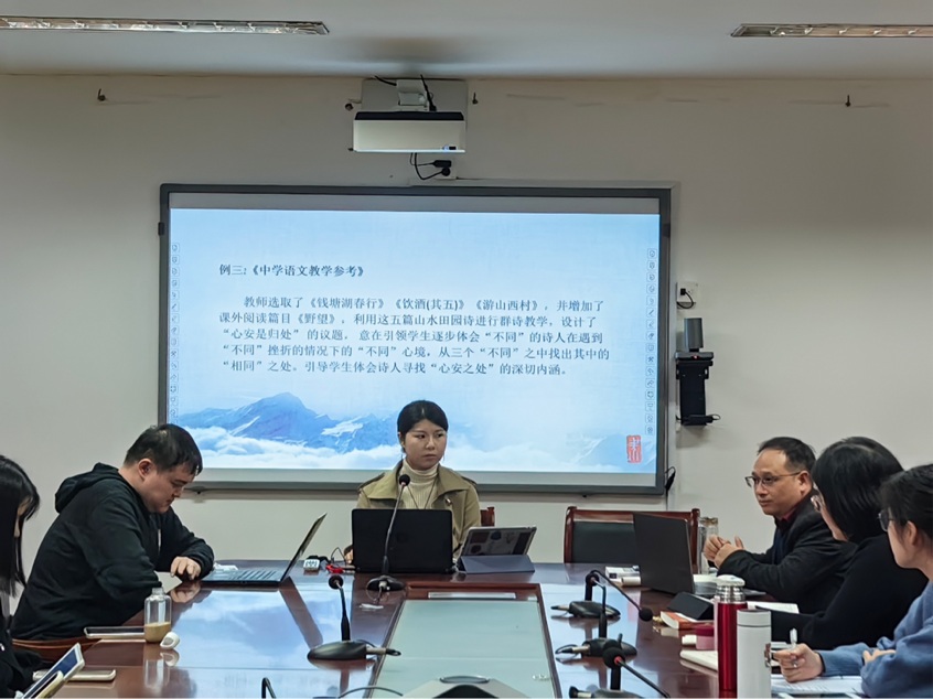 本期学术沙龙的主题是研读余恕诚先生的《唐诗风貌》和吴熊和先生的《唐宋词通论》两本著作,主讲人分别是徐杏、龚子湘和陈方玮。徐杏结合《唐诗风貌》,简要讲述了唐朝政治对杜甫诗歌创作的影响以及对杜甫诗歌教学的几点思考;龚子湘从《唐诗风貌》中对唐代山水田园诗的分析、王孟山水诗的风貌特征和中学课堂中的山水田园诗教学三个方面进行了评析,并结合自己的支教经历分享了自己的心得体悟;陈方玮结合实际的语文诗词教学,细致地解读了《唐宋词通论》表现的语言美和风格美。