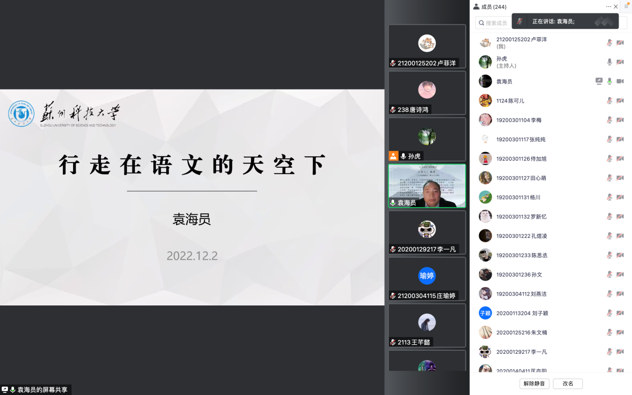 12月2日,江苏省语文特级教师袁海员为252名汉语言文学师范专业的同学带来云端讲座——《行走在语文的天空下》,讲座由必一运动bsport体育副经理孙虎主持。