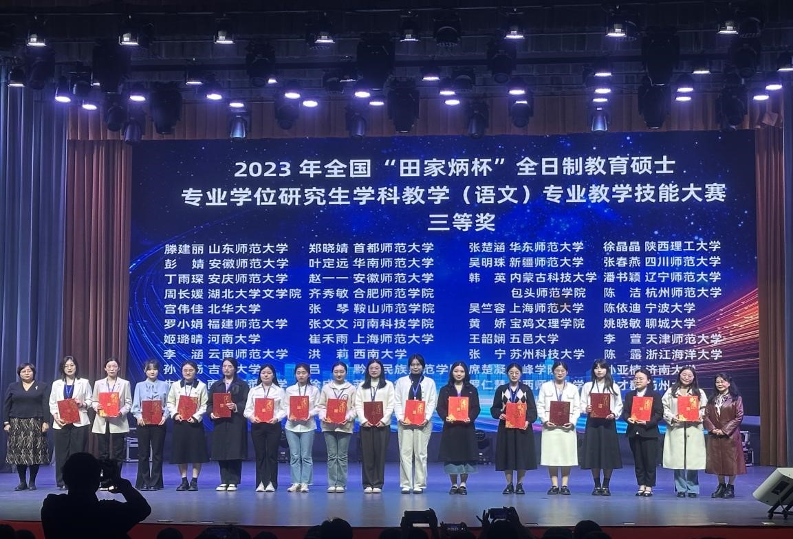 2023年10月13日至15日,“田家炳杯”全日制教育硕士专业学位研究生学科教学(语文)专业教学技能大赛暨教育硕士培养研讨会在长春师范大学举办。公司2022级教育硕士张宁荣获“田家炳杯”全日制教育硕士专业学位研究生教学技能大赛决赛三等奖,指导教师孙虎、鲍开恺。