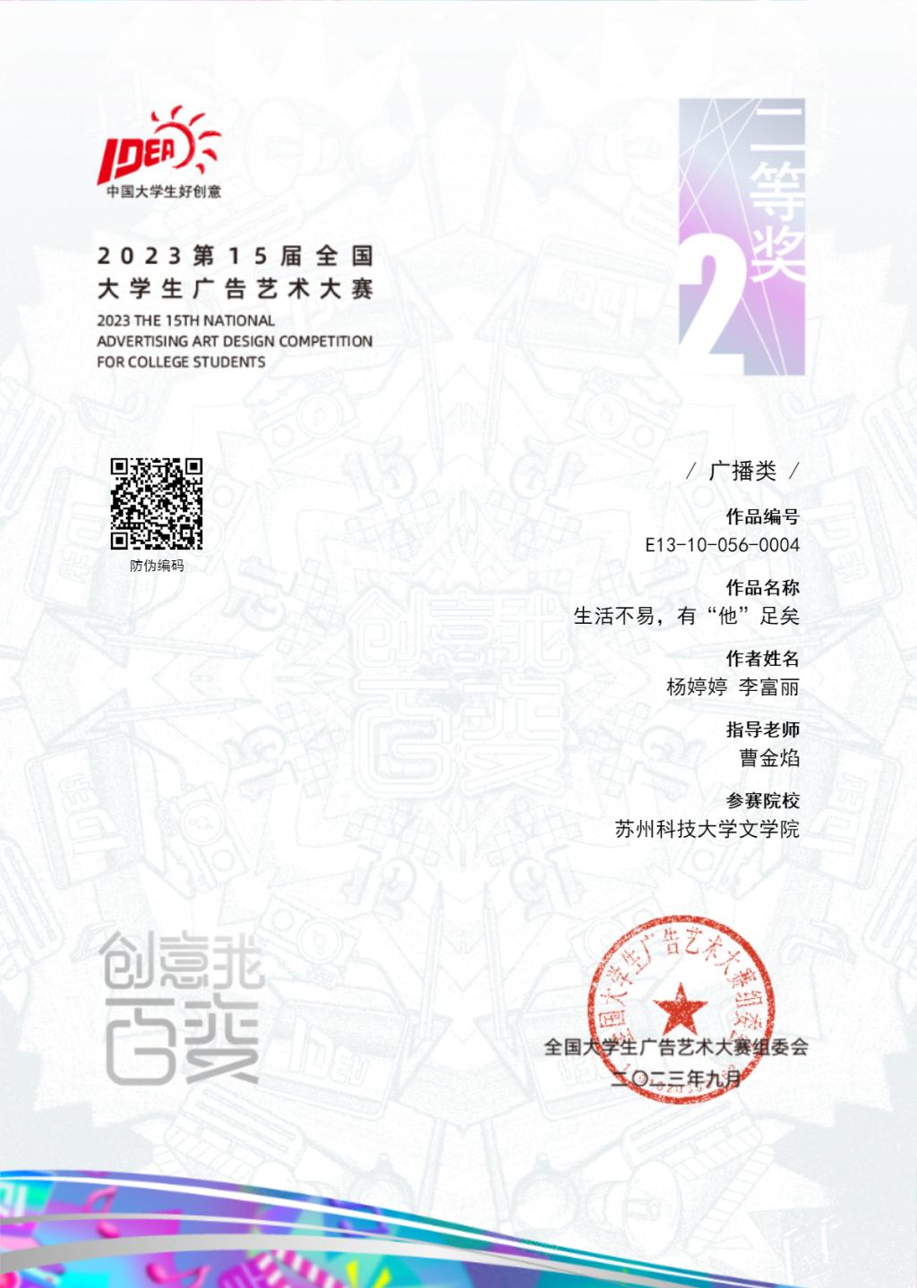 此次大赛,必一运动bsport体育员工杨婷婷、李富丽的广播广告作品《生活不易,有“他”足矣》获全国二等奖。叶铃娇、袁湘同学的广播广告作品《中国女排,中国雕牌》,凌莉、房子涵、裔传杰、王海萌、张庭莹同学的视频作品《青丝秀发,缘系百年》获全国三等奖,另有全国优秀奖一个,江苏省赛区二等奖1个,三等奖2个,省级优秀奖3个。