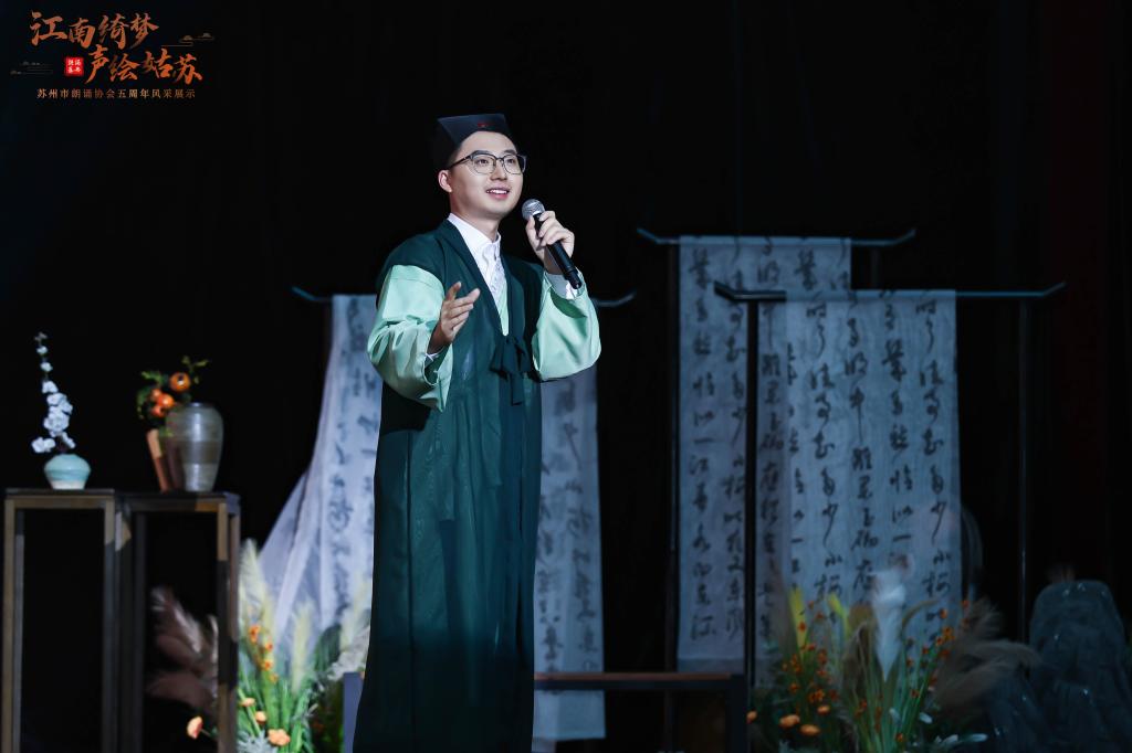 朗诵风采展示庆典在公司老员工艺术舞蹈团带来的《只此青绿》中拉开序幕。苏州市朗诵协会会员、苏州大学和公司师生纷纷上台,以声音为媒,以朗诵传情,营造了浓厚的艺术氛围。风采展示会通过《千年繁华》《家在古城》《青春如歌》《爱到深处》四个篇章,带领观众穿越千年的江南烟雨,领略姑苏历史的繁华瑰丽,感受一代代苏州人浓浓的姑苏情,沉醉于昂扬蓬勃的青春气息,体会对祖国和人民的深沉而细腻的爱。这是一场汇聚“苏州好声音”的视听盛宴,它让苏州文化、中华经典文化始于声音、美于诵读、感于内心、“声声”不息。