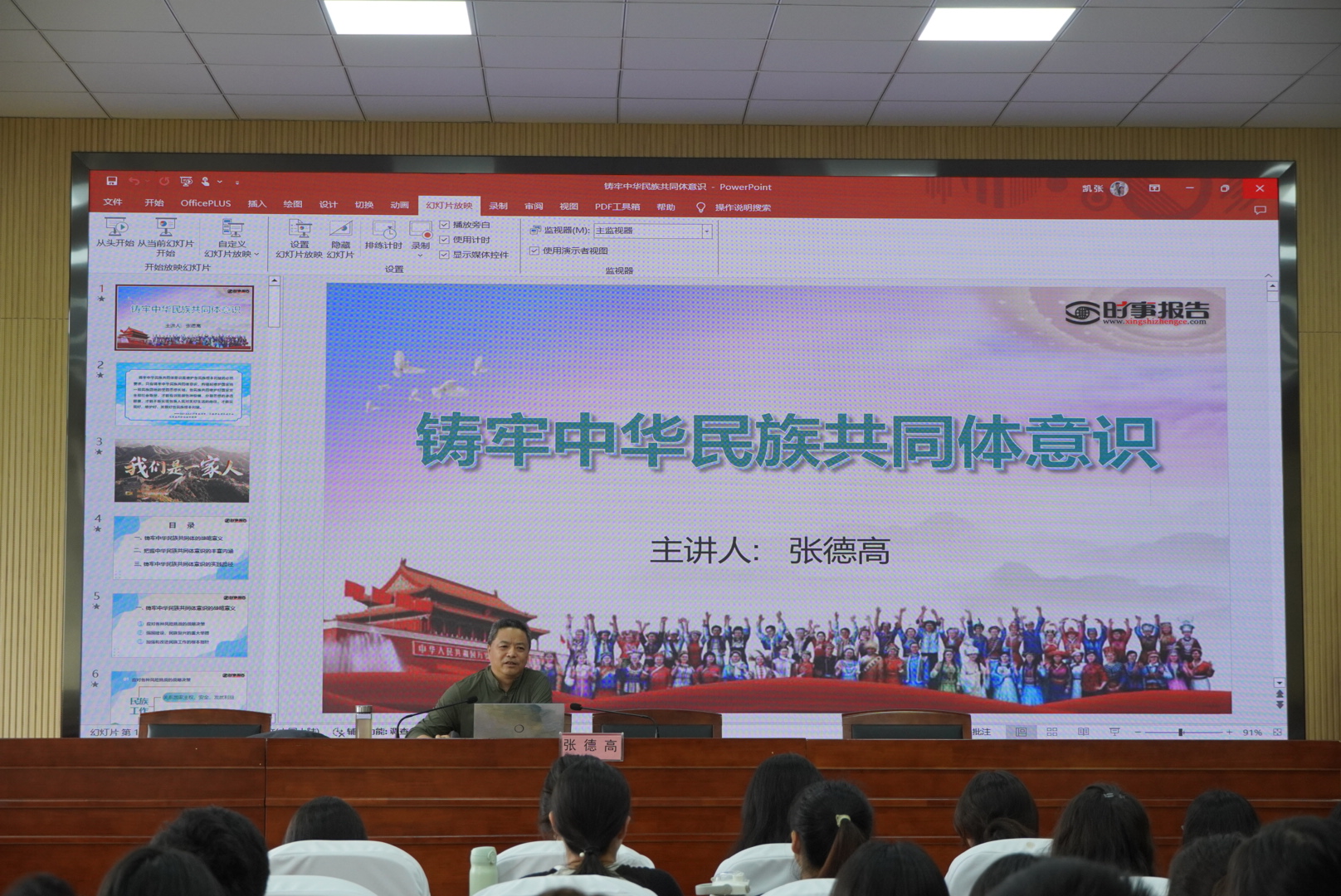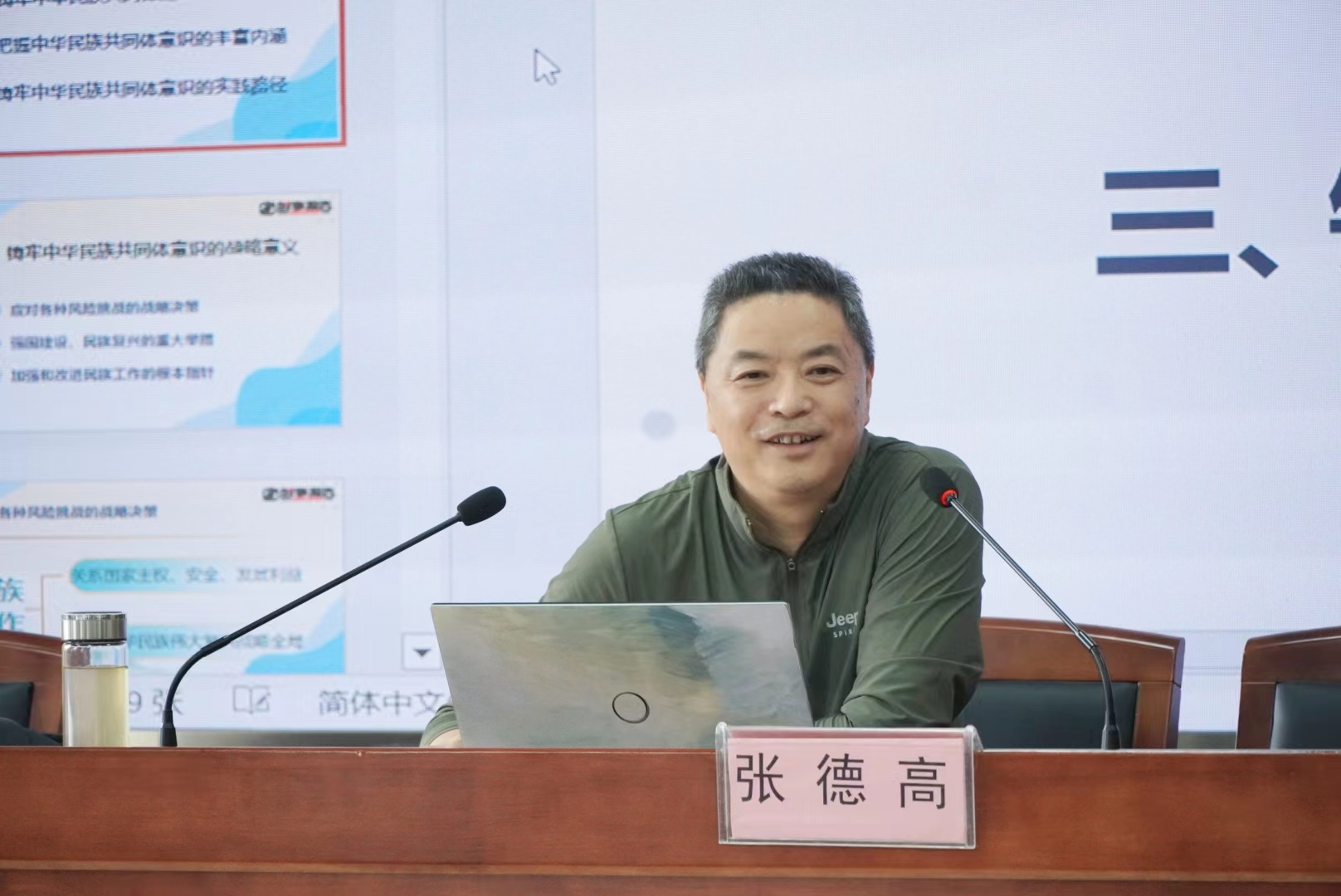 张德高结合当前时事,围绕“铸牢中华民族共同体意识的战略意义”、“把握中华民族共同体意识的丰富内涵”、“铸牢中华民族共同体意识的实践路径”三个方面进行了详细讲述,他指出各民族共同开拓了辽阔疆域、共同书写了悠久历史、共同创造了灿烂文化、共同培育了伟大的民族精神。他强调,作为新时代的青年,要树立正确的中华民族历史观,深入践行社会主义核心价值观,始终把中华民族利益放在首位。