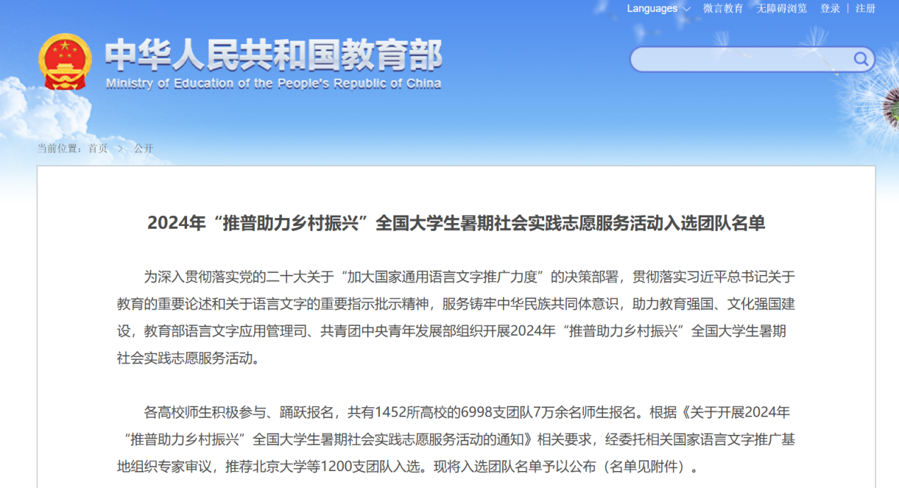 7月2日,教育部发布《2024年“推普助力乡村振兴”全国老员工暑期社会实践志愿服务活动入选团队名单》,公司“普润乡音”志愿服务队成功入选。