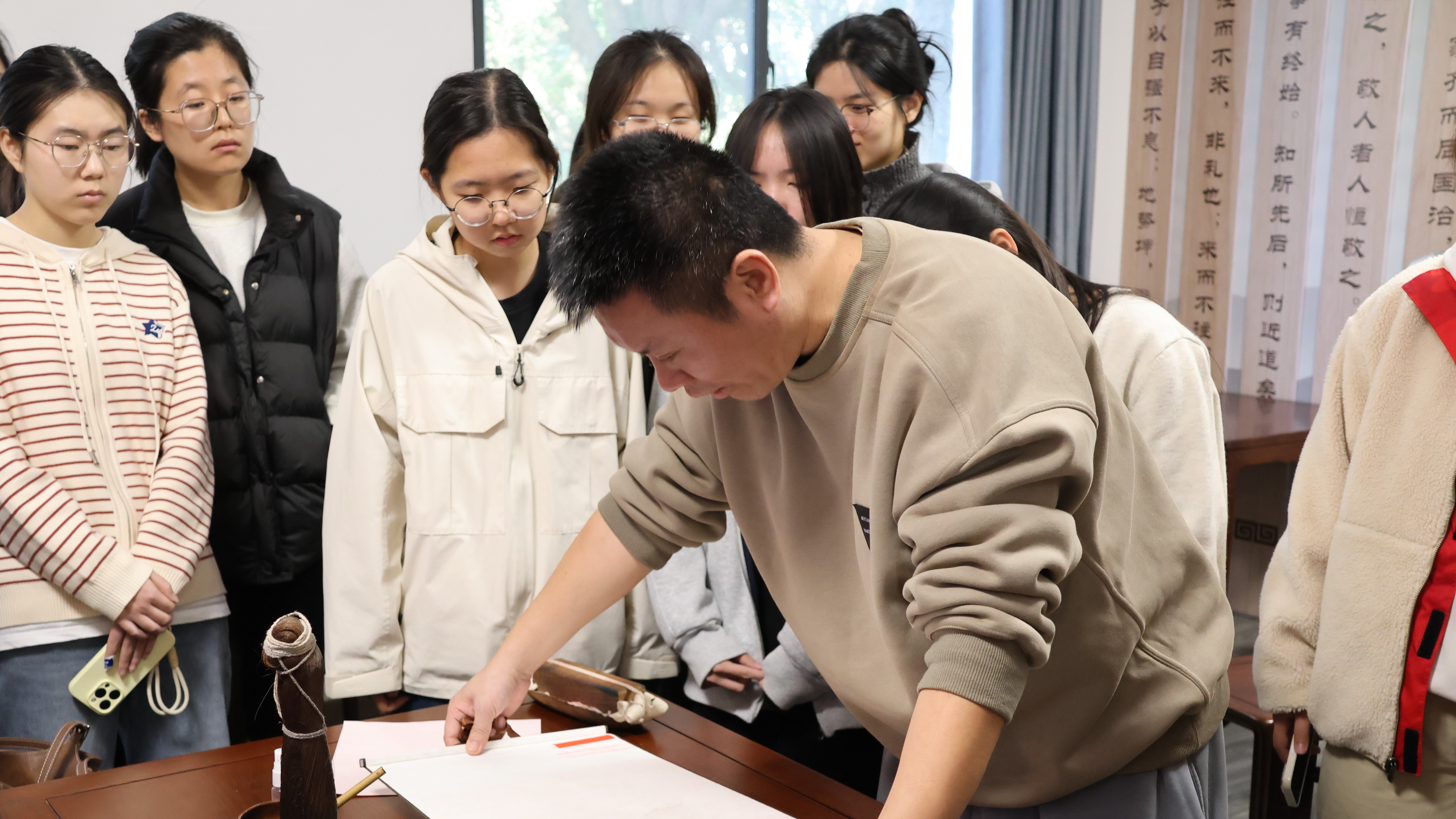 从明清鼎盛时期的绚烂多彩,到近代以来的融合创新,孙一波将桃花坞木刻年画置于时代洪流与文化变迁的宏观视野中,讲述了这一方木版如何承载江南人民的审美理念与生活哲学。他不仅剖析了《一团和气》圆融构图背后“和合共生”的处世智慧,更通过一幅幅经典作品,揭示出年画中蕴含的吉祥寓意、民俗记忆与地域精神。“这不仅是技艺的留存,更是江南气韵、人文情怀在一拓一印间的凝结。每一道墨痕,都曾承接过来自历史深处的目光。”孙一波轻轻抚过木版上深浅不一的纹路,动情地向同学们说道。
