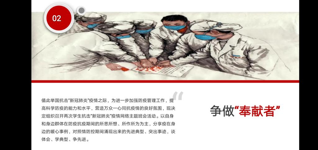 之后于倩同学与大家分享了她搜集到的逆行者的事迹。他们来自全国各地,他们在疫情面前义无反顾,他们的事迹深深震撼着我们的心灵。于倩同学也讲述了她在社区担任志愿者,每天为过往人员登记信息、测量体温的经历。“逆行”的路上,不止只有逆行英雄,还有14亿分之一的你我,只要我们坚定信心,科学防治,就一定能战胜疫情!