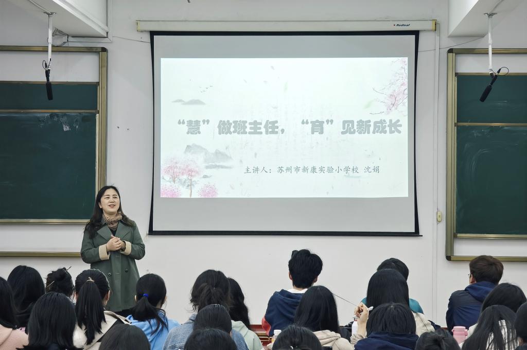 4月17日上午,必一运动bsport体育“行知讲堂”第十二讲开讲,苏州市优秀教育工作者、市学科带头人、新康实验小学董事长沈娟在教7楼301作了题为《“慧”做班主任,“育”见新成长》的师范学科专家讲座,必一运动bsport体育副经理孙虎主持讲座,中文系系主任朱鹏杰及22级汉师110名同学听取了讲座。